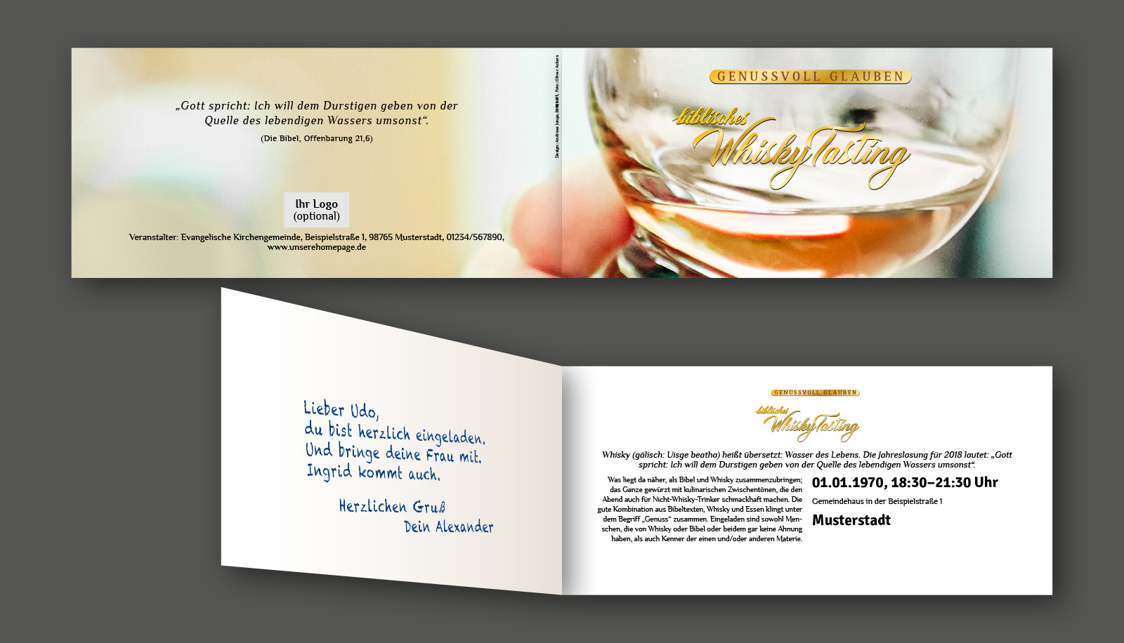 Außerdem gibt es eine wertige Einladungskarte (nur WhiskyTasting). Damit kann vielleicht auch ein spezieller Kreis zum Beispiel von (potenziellen) Unterstützern der Gemeinde eingeladen werden. Eine gute Möglichkeit ist es auch, wenn der Abend lange genug im Voraus geplant ist, bei Trau- oder Taufgesprächen auf den Abend hinzuweisen und eine Einladungskarte zu überreichen. Für diese Veranstaltung ist die Massenwurfeinladung jedenfalls nicht die angemessenste Form. Eine gezielte, persönliche Einladung ist hier eher angebracht.